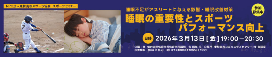 【東松島市スポーツ協会主催セミナー】 睡眠不足がアスリートに与える影響・睡眠改善対策「睡眠の重要性とスポーツパフォーマンス向上」開催!! ~適切な睡眠とは~ 今回のセミナーでは睡眠不足がアスリートにどんな悪 …