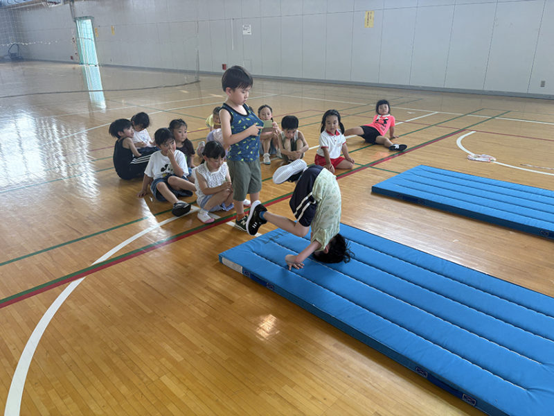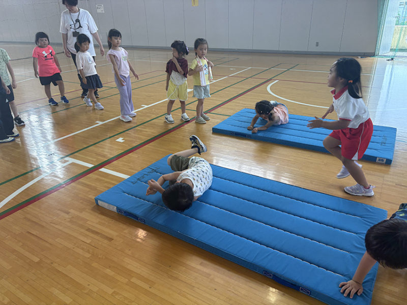 7月9日のきっずジムは!! 7月9日(水)第7回目のきっずジムは準備体操後、みんなで鬼ごっこやボール転がし、マット運動を行いました。次回のきっずジムは7月16日(水)になります。(熱中症対策として水筒は多めに必ず持参してください。) 投稿日:2025年07月08日 17:14